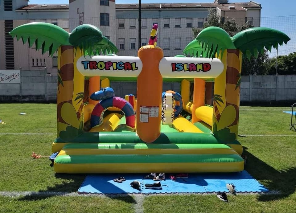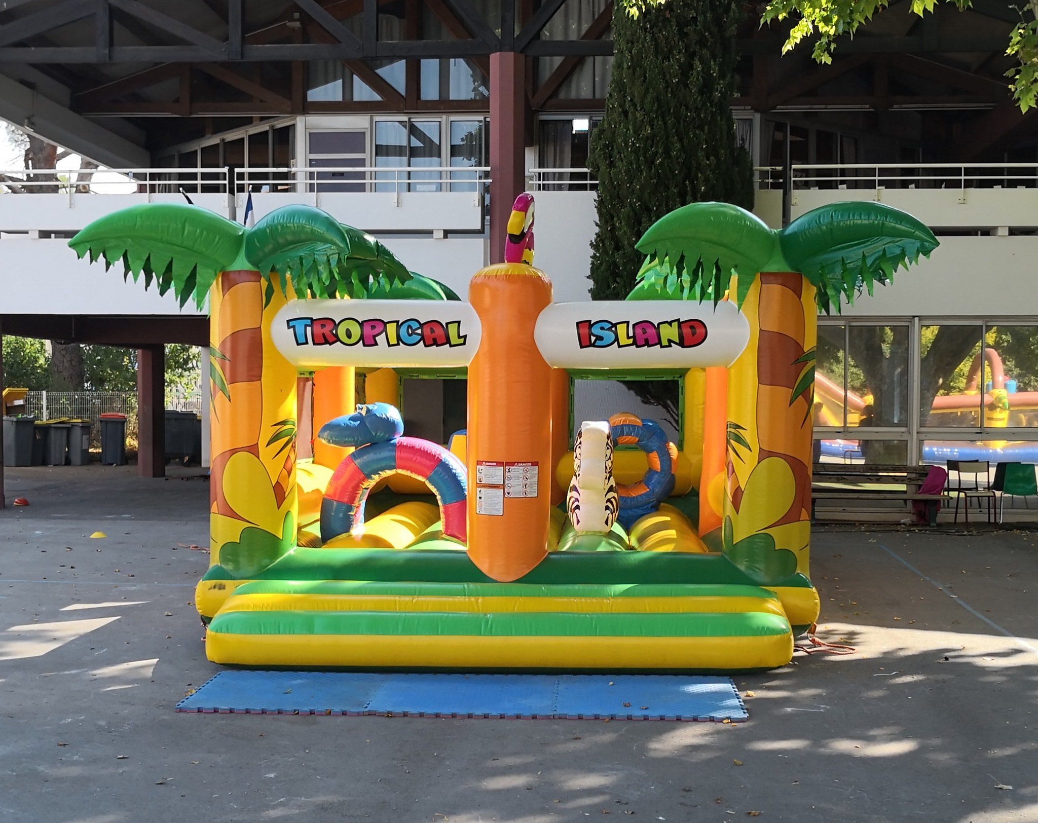 Sur le thème des îles tropicales, cette structure gonflable propose 2 espaces de jeux, avec des obstacles gonflables tels que des zèbres, serpents et crocodiles.